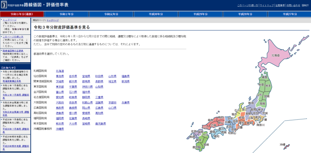 上記は国税庁の、遺贈または贈与により取得した財産に係る相続税及び贈与税の財産を評価する場合に適用される路線価を公表したページです。